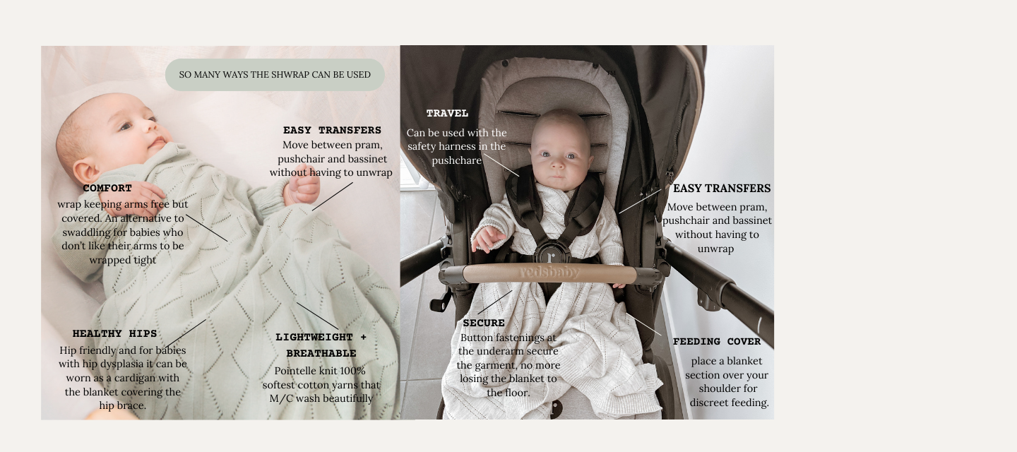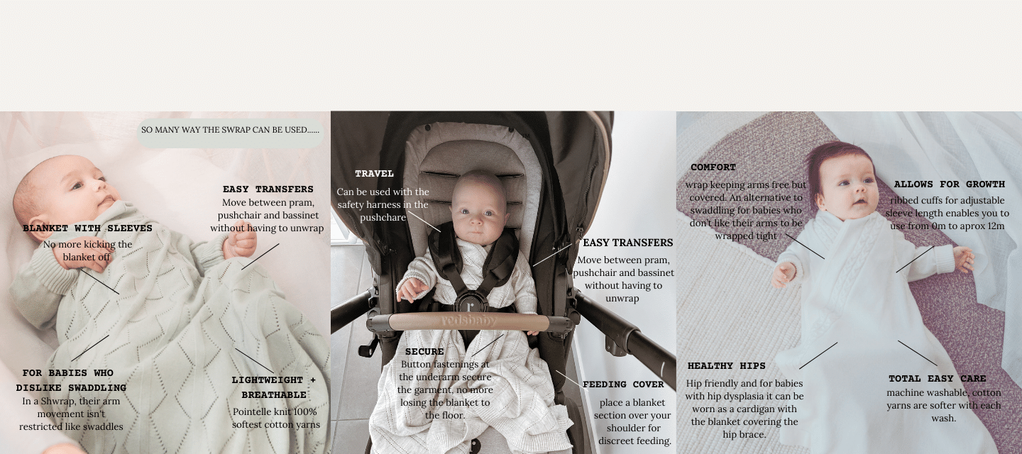 nurturing care. Our signature Shwrap™ is a unique blanket with sleeves created using the softest 100% cotton yarns. Lightweight for Summer and multi ended for cooler months. For NB up to approx 12m.