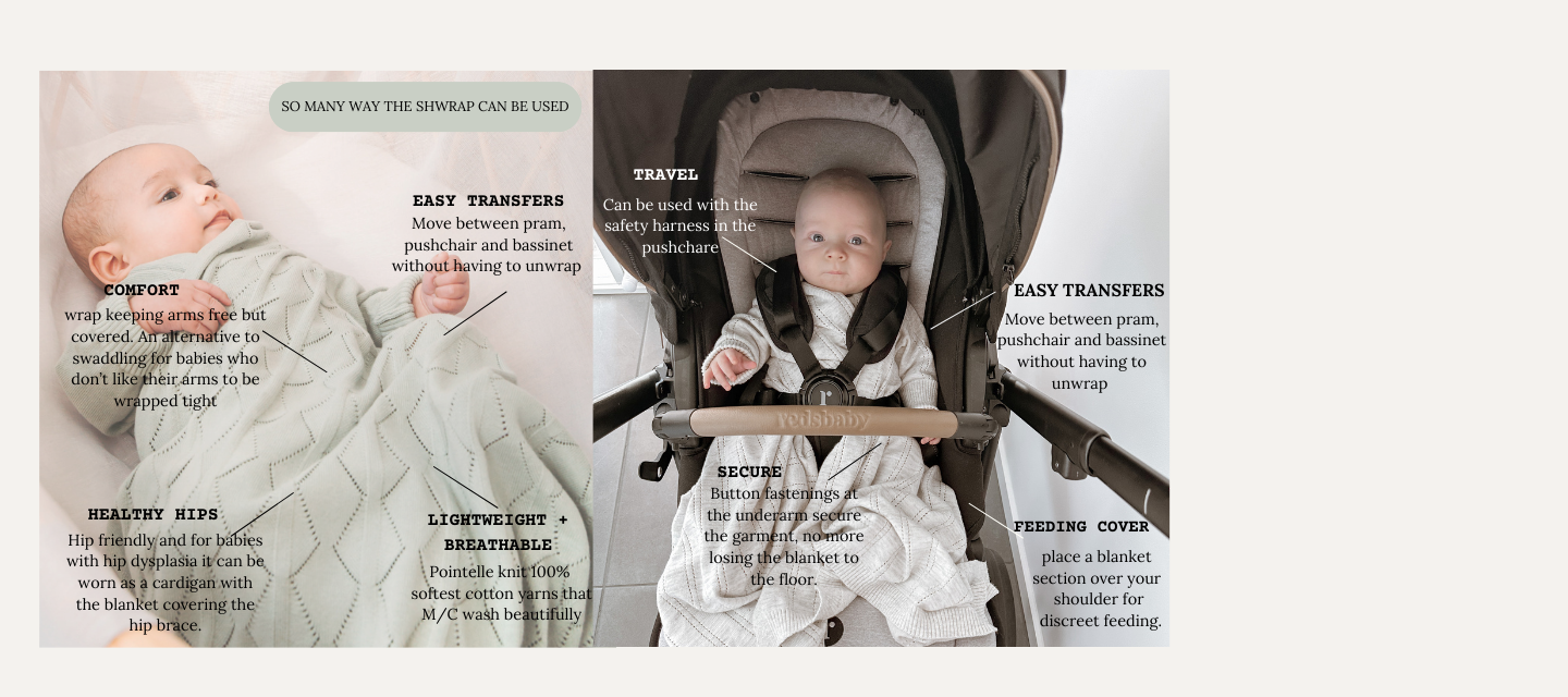 nurturing care. Our signature Shwrap™ is a unique blanket with sleeves created using the softest 100% cotton yarns. Lightweight for Summer and multi ended for cooler months. For NB up to approx 12m.