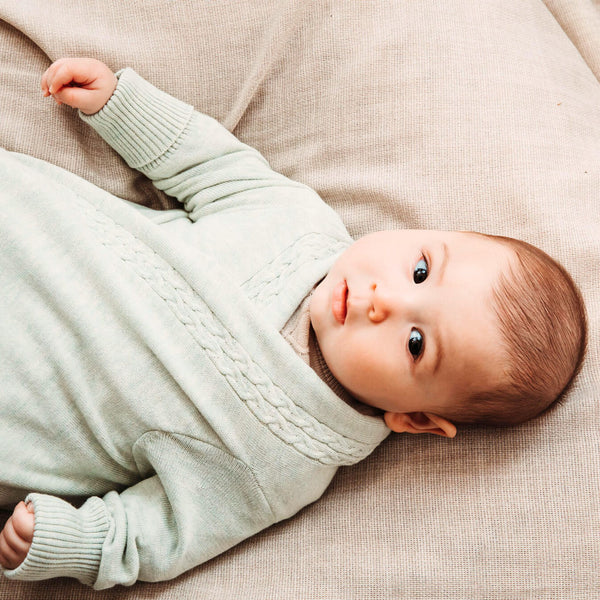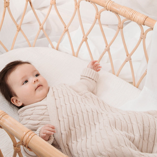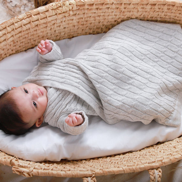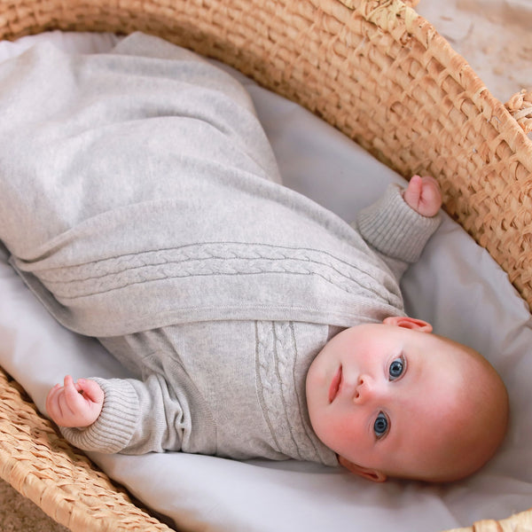 A luxurious yet practical knitted blanket with sleeves combining the functionality of a blanket with the addition of sleeves, allowing for unrestricted arm movement while keeping your baby comfortable and secure. 100% soft cotton yarns, It’s the perfect travel accessory that can be used with pushchair safety straps. Never lose your blanket to the floor again with this breastfeeding friendly and hip-friendly accessory. A unique & thoughtful baby gift.
